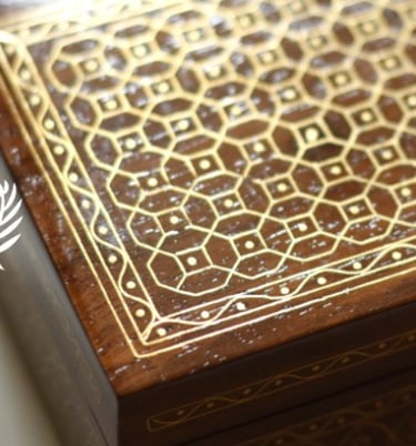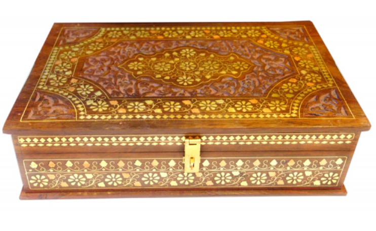Materials: Sheesham or mango wood with hand-cut brass inlay